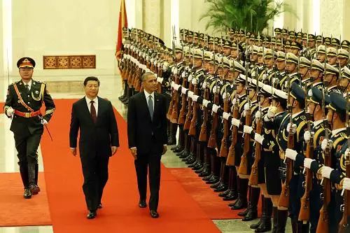 图为:2014年11月12日,习近平在北京人民大会堂举行欢迎仪式,欢迎美国总统奥巴马对中国进行国事访问。