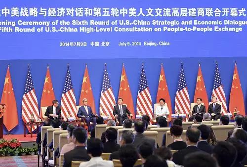 图为:2014年7月9日,第六轮中美战略与经济对话和第五轮中美人文交流高层磋商联合开幕式在北京举行。国家主席习近平出席开幕式并致辞。
