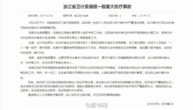 浙江通报重大医疗事故:确诊5例患者感染艾滋病病毒
