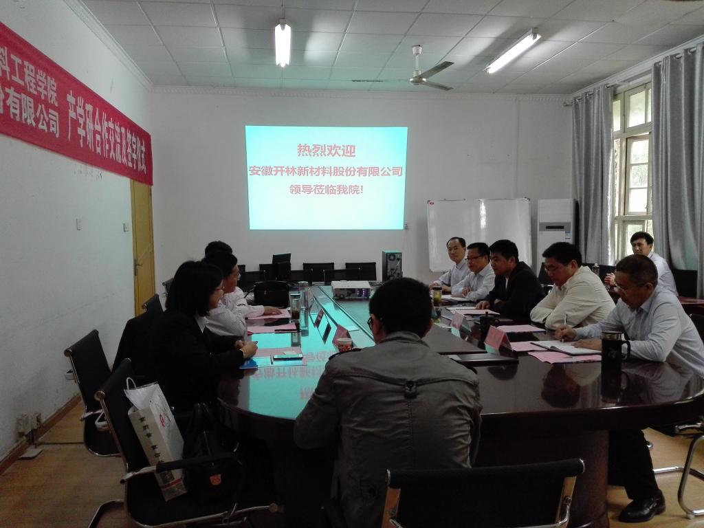 5月3日上午,化学与材料工程学院和安徽开林新材料股份有限公司在化学与材料工程学院会议室举行产学研签约仪式。校党委委员、副校长汪建飞,天长市人大常委会财经(预算)工作委员会副主任孙光明,安徽开林新材料股份有限公司董事长王和山、技术部主任王和东、行政部长张万霞,化学与材料工程学院党总支书记王明清、院长俞浩、副院长汪徐春、材料工程系主任陈君华及相关教师出席签约仪式。仪式由王明清主持。