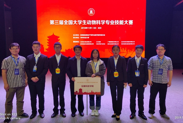 动物科学学院戴四发、王淑娟、胡洪、吴学壮、任清长、白晰等老师共同担任此次比赛指导教师,其中戴四发同时担任领队老师,王淑娟被选为本次大赛的项目三的裁判。经过激烈的角逐,动物科学专业2017级学生任文静、邓在双、霍守雨、王威和叶美玲等五位同学组成的安徽科技学院动物科学学院代表队以严谨的态度、默契的配合和熟练的操作技能在比赛中展现了风采,赛出了水平。